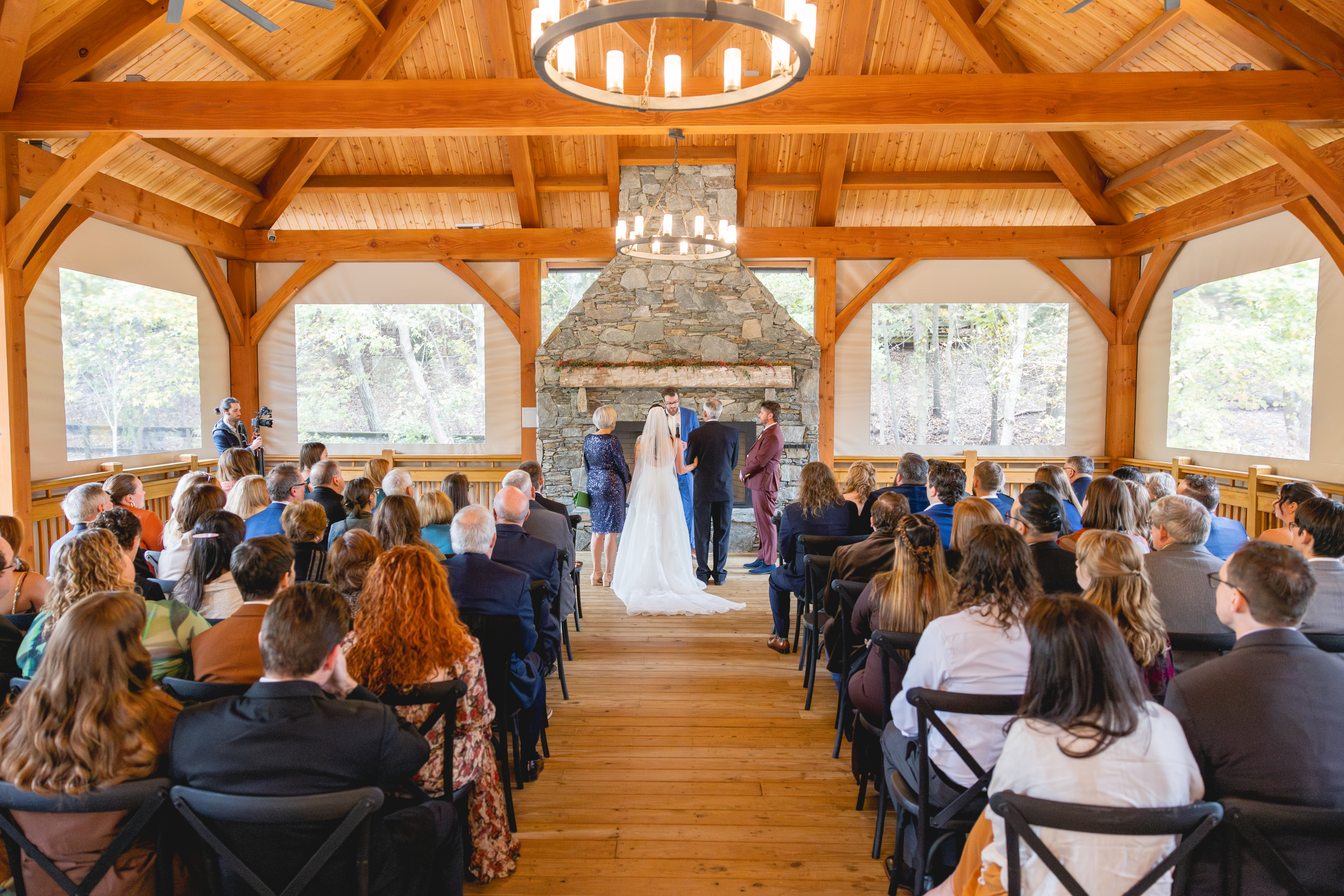 The ceremony took place right along the water. No overcomplicated altar. No heavy décor. Just wooden beams, windows, and a giant fireplace with rustic candeliers.